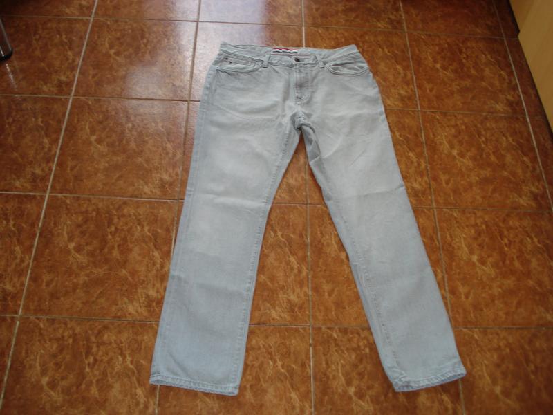 Екслюзивні TOMMY HILFIGER зі щільного деніму (100% бавовна) сірого із синім відтінком кольору в гарному стані. Крій класичний: висока посадка, п'ять кишень, подвійні шви ланцюговим стібком, латунні кнопки та ґудзик, шкіряний патч. Обсяг талії 88 см, висота посадки спереду 26 см, висота посадки ззаду 38 см, напівобвід у стегнах 55 см, довжина 105 см по зовнішньому шву, 81 см — по внутрішньому шву, ширина внизу 19 см.