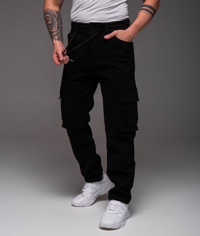 Чоловічі теплі джинси на флісі чорні на резинці з ґудзиком, накладними кишенями