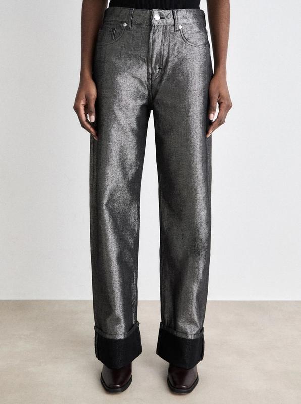 Матеріал приємний на дотик, із додаванням натуральної бавовни (70%) та змішаних волокон для кращої зносостійкості. Є елементи тваринного походження. Ідеально підійдуть тим, хто шукає унікальну річ з яскравим металізованим ефектом. Характеристики: Колір: сріблястий Посадка: висока Застібка: прихована блискавка Матеріал: 70% бавовна, 20% інші волокна, 10% поліестер Тканина: денім Розмір: UK 30/32 Ширина поясу: 41 см Довжина виробу: 107 см