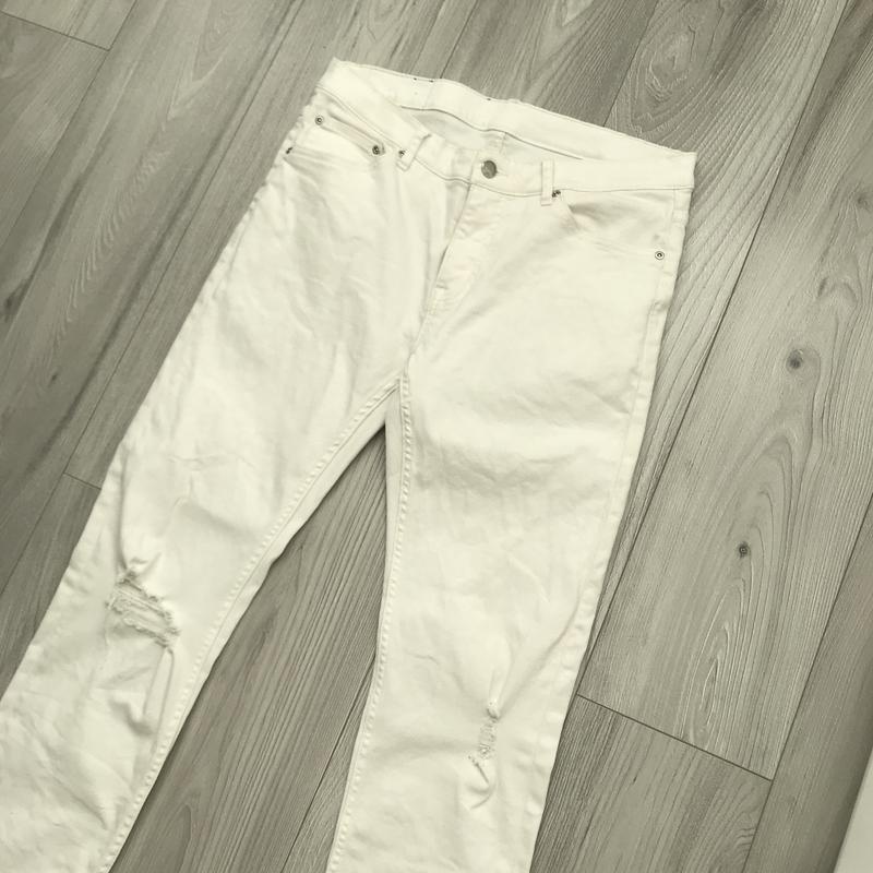 Cheap Monday Sonic Summer White Состояние отличное (вблизи рассмотрел маленькую точку на последнем фото слева от монеты). Цвет белый, как на фото с черной биркой. На остальных фото баланс белого камеры ошибся. Размер на бирке 33/32. Немного заужены. Тянутся, так как в составе 1% elastan. Заводские протертость на коленях.