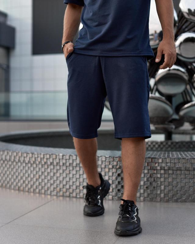 Шорти 'Player' cині Артикул: 1620290718 - Материал: трикотаж высокого качества. - Стиль: оверсайз. - Стиль ношения: повседневный (casual). - Сверху на шортах резинка + шнурок для дополнительной фиксации. - 4 кармана: два прорезных спереди и два накладных сзади. - Шорты имеют широкий свободный крой.