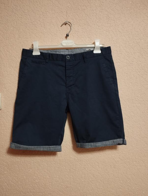 Фірмові темно-сині чоловічі шорти,розмір W34(86см пояс) на 48-50розмір. Тканина якісна 98%бавовна,2%еластан. Тягнеться дуже добре,тримає форму,середня щільність. Шорти не важкі. Застібка на гудзики,5прорізних кишень. Низ штанини на манжетах. Прямі неширокі,дуже стильні шорти. Стан відмінний,без дефектів і слідів ношення. Заміри по верху виробу: Пот-44см. Поб-51см. Посадка по переду-25см,посадка по заду-34см. Довжина по боковому шву-46,5см,довжина по шаговому шву-21см. Ширина штанини зверху-30см,ширина по низу штанини-23,5см. Без торгу.