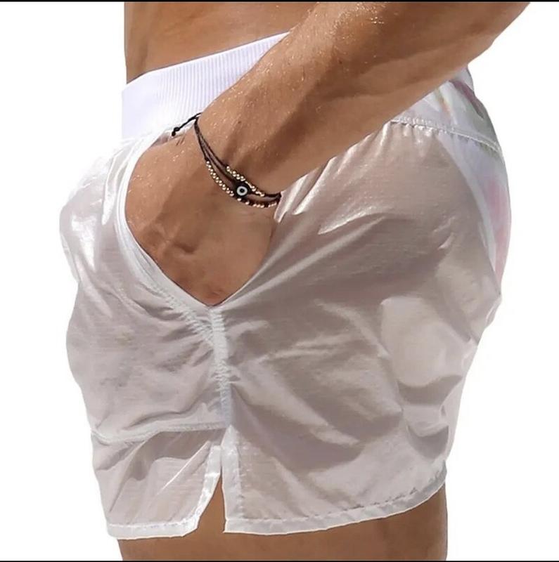 Мужские плавки с эластичным поясом, прозрачные летние пляжные шорты, с низкой талией, с карманами.