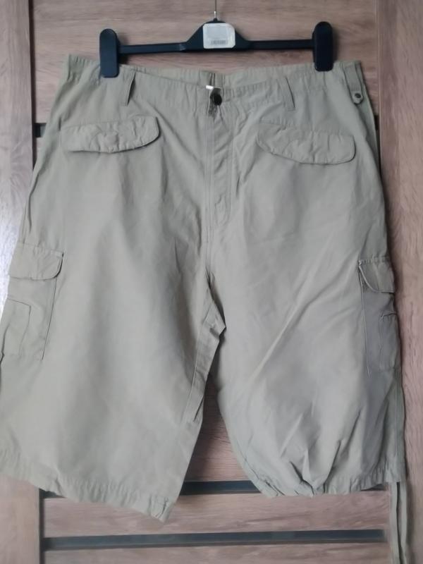 Розмір 52, ПОТ-48см, ПОБ-60см, довжиа-67см, ширина штанини внизу-32см, посадка-33/46см. Легенькі. 70% котон, 30% поліамід. стан нових.