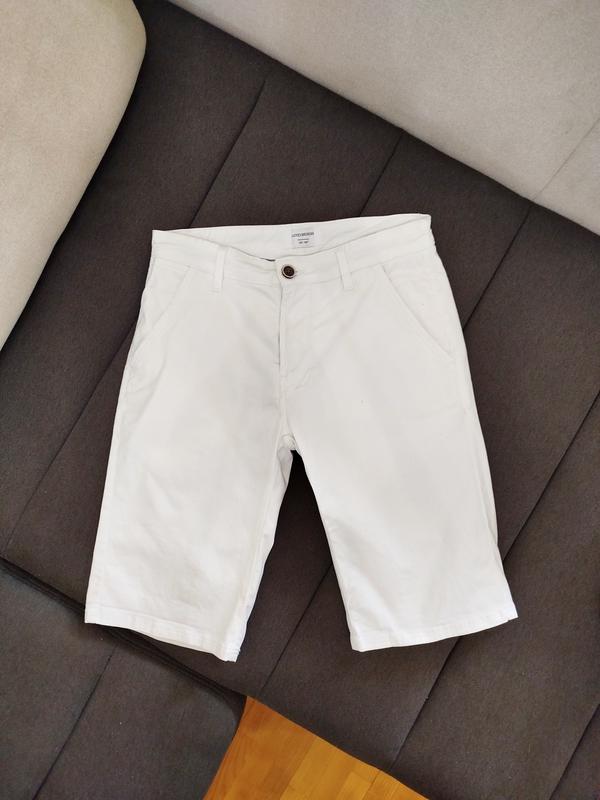 Білі чоловічі шорти класичної середньої довжини. Матеріал якісний, достатньо щільний. Середня посадка. Ширина в поясі: 37 см. Ширина у стегнах: 50 см. Висота посадки спереду (від паху до верху): 26 см. Висота посадки ззаду: 30 см. Довжина: 55 см. Відправка будь-якою поштою або самовивіз у Києві. При доставці поштою безкоштовна упаковка