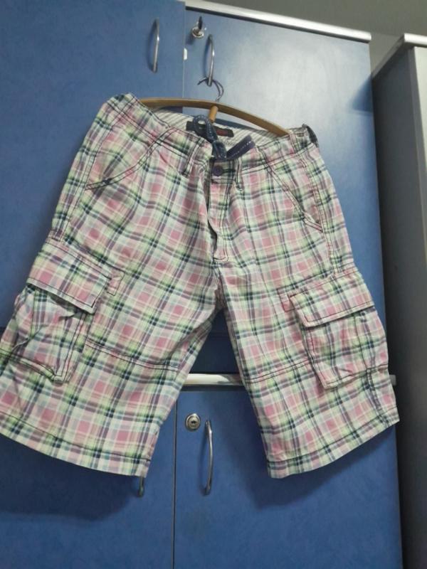 Шорты почти новые,в красивую цветную клетку, много карманов, изнутри на шнурок Замеры: длина 55/30см, посадка 30см,обхват в пояса 88-90см,в ягодицах до 114см штанина в.стегах 66см, по низу 54см.100%котон