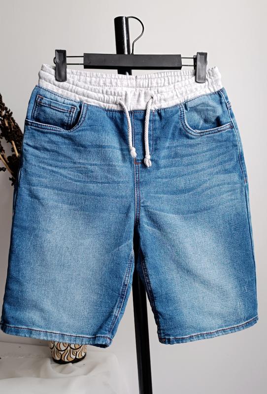 чоловічі джинсові шорти на резинці синього кольору розмір зазначений 33, але орієнтуйтесь по замірах ПОТ 34 см тягнеться до 40 см ПОБ 50 см посадка спереду 28 см посадка ззаду 38 см довжина по зовнішньому шву 51 см ширина штанини внизу 24 см 80% бавовна 19% поліестер 1% еластан тканина добре тягнеться