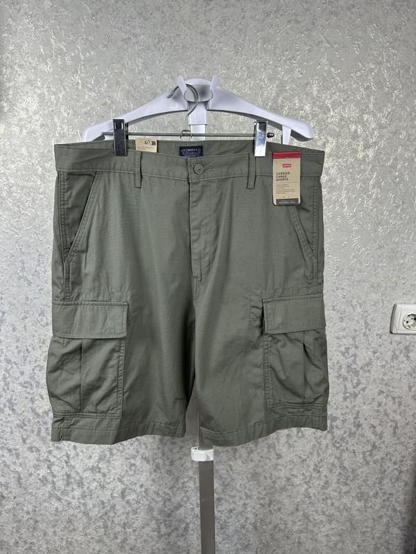 Чоловічі оригінальні карго шорти Levis у кольорі хакі. Розмір 36. Досить просторі і зручні для повсякденного використання Заміри: Пояс 48 см Стегна 60 см Довжина 55 см Вихід знизу 30 см