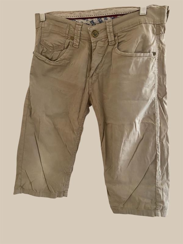 Чоловічі шорти, бриджі В дуже хорошому стані Склад: 98% бавовна, 2 % лайкра Недолік: порван кармашек, як на фото Молнія в робочому стані Розмір: 29 Розмір по поясу: 39 см Довжина штаніни: 57 см Дякую за ваш вибір!
