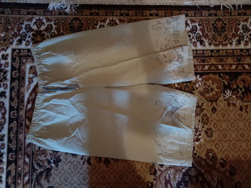 Довжина по боковому шву 65см , по внутрішньому 34см , ПІТ 49см , (гумка , шнурок), ПОБІДИ 56 см , бавовна .