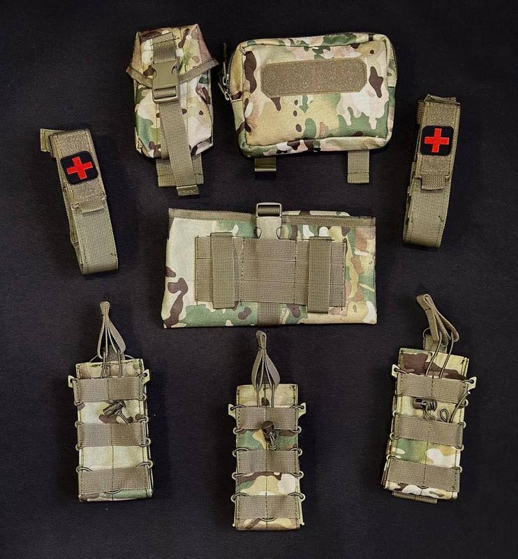 Кілька примірників у наявності Комплект Нагрудна сумка 1 шт Чохол під турнікет 2 шт Підсумок під гранату 1 шт Сумка скиду 1 шт Підсумок під АК з пластиковими боками 3 шт Матеріал: Міцна, водонепроникної тканини Кордура 900D. Для пошиву використовується якісна поліамідна стропа. Всі вироби прошиті армованими нитками. Нагрудна сумка 17*12*4 см Сумка скиду 27 х 25 см Розмір: Мультикам