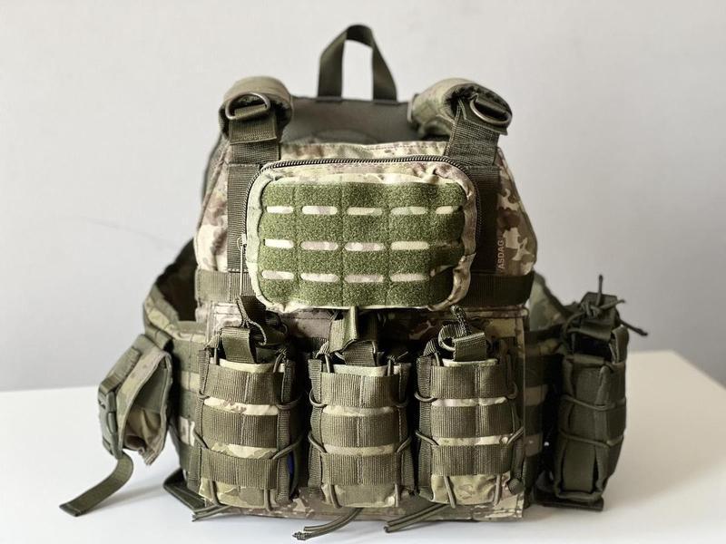 Кілька примірників у наявності Виготовлений з міцного матеріалу Cordura . Матеріал плитоноски Cordura Asdag виготовлена із оригінальноï кордури 1000d. Це найщільніший матеріал. Тільки кордур може витримати сталеві плити. По всій площині застосована система MOLLE. Трансформована система підсумків, які можна трансформувати під власні потреби Регулюється як по висоті так і по обьєму Вся фурнітура виготовлена з поліаміду Регульовані м'які лямки. Розмiр регулюється бічними та плечовими липучками Має 7 кишень: 4 кишені під магазини, 1 під гранату, 1 під рацію та 1 підсумок великий (аптечка, особисті речі) Демпфер з внутрішньоï частини жилету для комфорту та захисту, сітка забезпечує вентиляції Пidходити для плит 25х30 см.