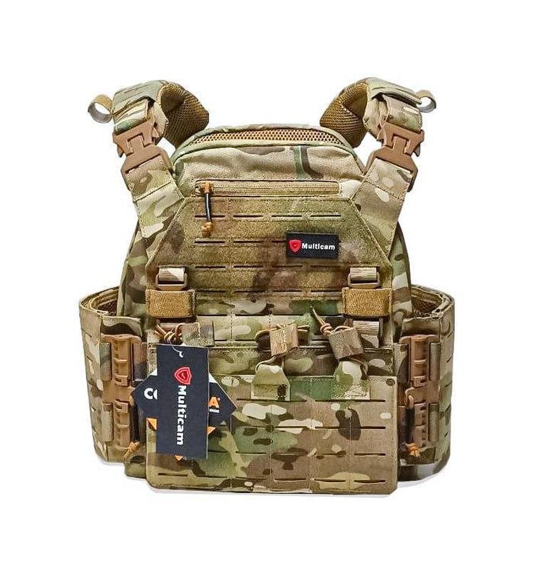 Кілька примірників у наявності Внутрішні кишені для бронепластин та балістики, 25смх30см, максимально: 28смх33смх2,5см Переваги: Матеріал – кордура 1000D Якісна фурнітура YKK Потужна ручка евакуації Система 4-х точкового швидкого скидання Вентильована внутрішня частина з м'якими бічними підтримками, що налаштовуються. Особливості: Два кріплення на плечових лямках для турнекетів Прошита армованою ниткою Бічні камербанди з гумкою забезпечують комфортне охоплення Бічні камербанди мають вбудовані дві кишені, для балістичного пакету та особистих речей. Знімна нагрудна кишеня MOLLE під 3 магазини( Якщо зняти кишеню під ним також MOLLE) Характеристики: Колір – мультикам (multicam) Регулювання по обхвату 75см-125см Регулювання за висотою 15см-20см Внутрішні кишені для бронепластин та балістики, 25смх30см, максимально: 28смх33смх2,5см Внутрішні кишені для бічних бронепластин або балістики: 18смх12см Вага – 1350 грам