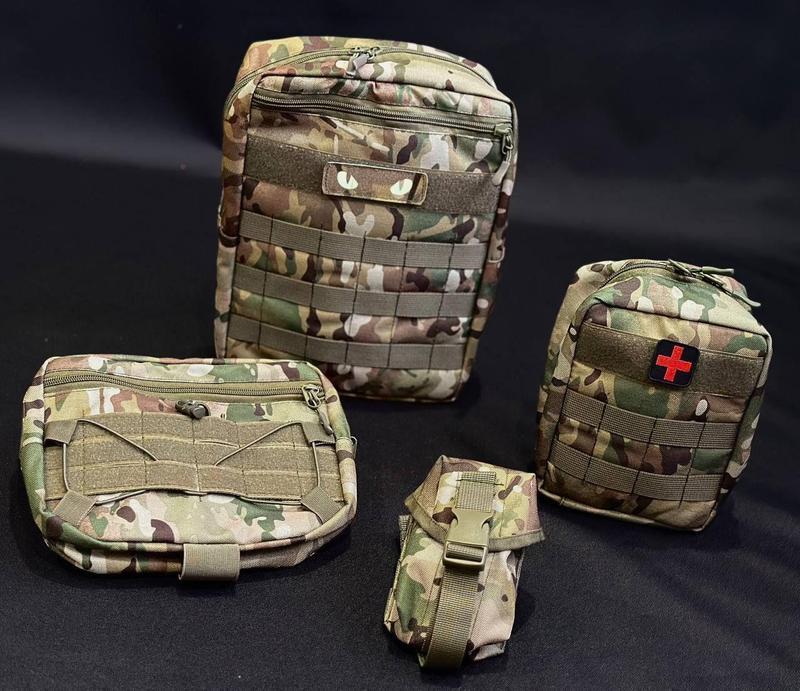 Кілька примірників у наявності Комплект Підсумок під гранату 1 шт Аптечка 1 шт Рюкзак 1 шт Напашник 1 шт. Матеріал підсумків : Міцна, водонепроникної тканини Кордура 900D. Для пошиву використовується якісна поліамідна стропа. Всі вироби прошиті армованими нитками. Аптечка 19х16х10 см Розмір напашника 25 х 20 х 5,5см Рюкзак розмір (см): 25/30/10 Основні характеристики Рюкзака • розмір (см): 25/30/10 • кріплення на системі MOLLE • має в середині 2 об'ємні кишені • може використовуватися як рюкзак для гідросистеми. • має велкро панель для кріплень шевронів та патчів. • закривається на блискавку. • додаткові стропи MOLLE спереду. • посилені шви • армовані нитки Рюкзак кріпиться позаду плитоноски не заважаючи виконувати завдання та переміщення. Чудово підійде для одноденних виходів. Тактичний напашник для предметів першої необхідності. Має відділ для встановлення балістичного захисту! Велика загальна кишеня з відділом на липучці під кевлар, для додаткової безпеки. Додадкова кишеня на фронтальній частині підсумка. Напашник легко кріпиться на тактичне спорядження за допомогою надміцної, широкой липучки. Фронтальна велкро-панель має систему MOLLE, що дозволяє прикріплювати до підсумка додаткове спорядження або патчі. Знизу підсумка еластична вставка для розміщення турнікету. Виготовлена з міцної, водонепроникної тканини Cordura 900D. Для пошиву використовується поліамідна стропа. Напашник прошитий армованими нитками, що підвищує термін служби. Розмір напашника 25 х 20 х 5,5см Матеріал: Cordura Розмір: Мультикам