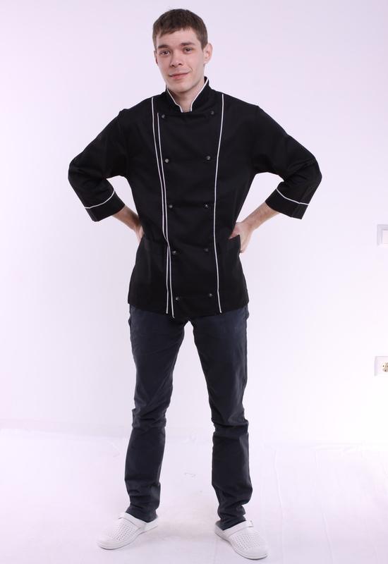 Китель двубортный черный с белой окантовкой Застегивается на две стороны (пуговицы- пукли). Легкий, летний вариант для работы на кухне с длиной рукава 3/4.Плотность ткани 115гр./м2. Ткань мягкая и приятная к телу- уникальное плетение дает хорошую плотность но не делает ткань грубой. Благодаря плотной основе выдерживает многократную стирку. Хорошо пропускает воздух и влагу Размер 38-64 Продукция отшивается из ткани которая имеет широкое применение и очень востребована, состав которой: 35%- хлопок, 65%- ПЭФ. У нас есть возможность отшивать из разной плотности ткани и в разных цветовых решениях