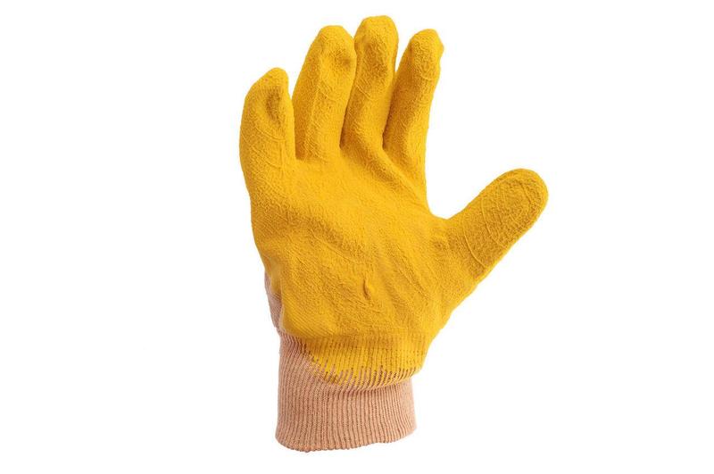 Перчатки стекольщика х/б ткань с латексным ребристым покрытием (желтые). Высокая эластичность. Исключительное сцепление, особенно на скользких поверхностях. Идеально подходят для работ со стёклами, зеркалами, керамической плиткой и проч. Обладают стойкостью к неорганическим растворителям, спиртам, пищевым жирам. Не подходят для работ с органическими материалами: маслами, смазками и т.д.