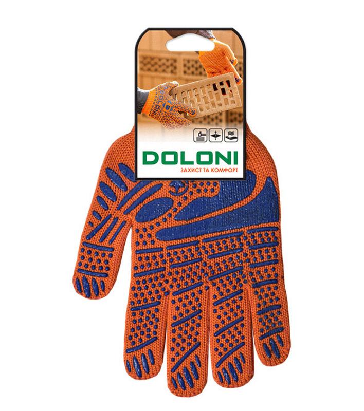 Doloni з ПВХ-малюнком 794 — Рукавички Склад: 60/40 (полієстер/бавовна) Розмір: 10 Клас в'язання: 7 клас Колір: жовтогарячий/синій Захисні властивості: від високих стиглих навантажень, антиковзні, для точних і загальних робіт. Рукавички захисні від легких і середніх механічних впливів.