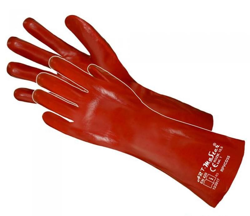 Захисні рукавички з ПВХ Artmas RPVCD35 kat.1 ### Захисні рукавички RPVCD35: Захисні рукавички з ПВХ із захисною манжетою. Манжета також оброблена покриттям з червоного ПВХ, завдяки чому рукавиця досягає в довжину 35 см і захищає велику поверхню руки. Надійні при сухому, вологому і масляному захопленні. Характеристики: - ### Всередині і зовні покриті ПВХ - ### Стійкість до багатьох видів розчинників, кислот, лугів і хімічних продуктів, в тому числі вуглеводних - ### Посилені бавовняної сіткою - ### Велика стійкість до протирання - ### Використовуються під час загальних механічних робіт - ### Еластичні і зберігають м'якість - ### Відповідають вимогам EN388 і EN420 - ### Довжина: 35 см - ### Розмір: 10 - ### Колір: червоний Сертифікат CE kat. 1 EN 420:2003+A1:2009 ### ###