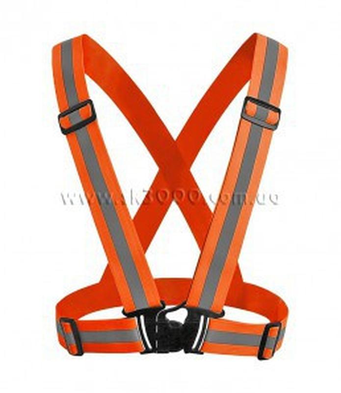 Жилет виготовлено з еластичної стрічки, шириною 4 сантиметри, яка має, по цетру, світловідбивну полосу(1,5см). Застібається на карабін. Гнучке регулювання розміру, у широкому діапазоні. Виробництво: Китай. Колір: яскравий помаранчевий.