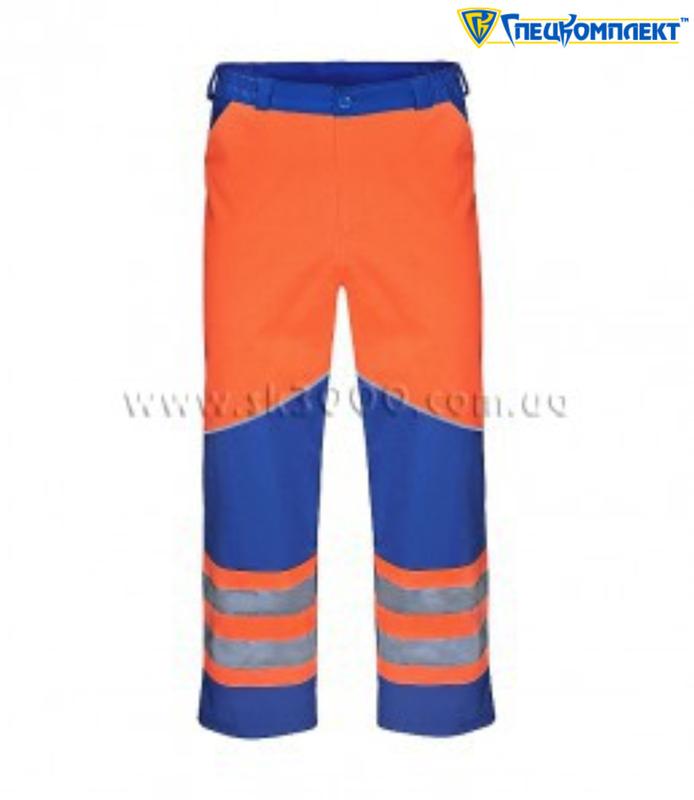 Штани "360в" прямі, виконані у комбінації волошкового та помаранчевого кольорів. Приточний пояс з застібкою, на гудзику, зі шльовками під вузький ремінь та гумкою з боків. Гульфік на блискавці. Бокові кишені з входами на вскіс. Штанини, нижче коліна, відрізні, у шов вставлений світловідбивний кант. По низу штанини нашита світловідбивна стрічка, в два ряди. Тканина: Дефенса. Колір: волошковий/помаранчевий.