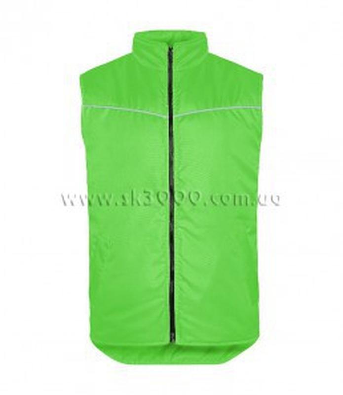 Жилет утеплений "Новатор", прямий, подовжений. Комір стійка. Застібаєтся на блискавку. Спинка та полочка з кокеткою, на яку нашит світловідбивний кант. Спинка має виступ з закругленими краями по низу жилета. Внизу кишені на вскіс, прорізні, в листочку. Тканина: Оксфорд(100% синтетика, водовідштовхуюче просочення). Колір: лимонний. Утеплювач: один шар синтепону. Підкладка: поліестер.