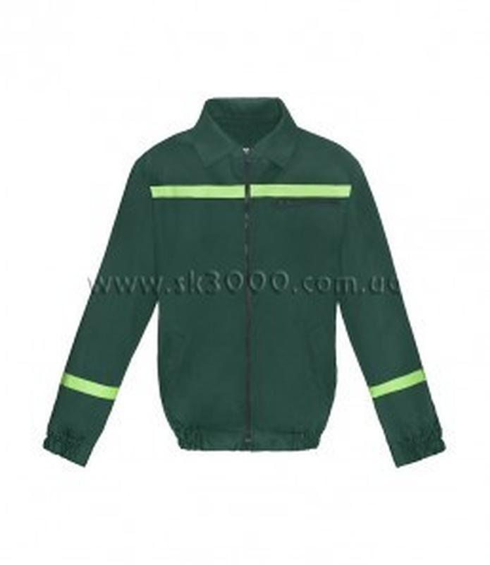 Куртка "Модуль" пряма, укорочена з застібкою на блискавку та відкладним коміром, з приточним поясом на гумці та втачним рукавом з манжетою на гумці. З лівої сторони знаходиться нагрудна врізна кишеня, що затібається блискавкою. Нижні кишені з вхідом на вскіс, врізні, з листочкою. Яскраво- зелена світловідбивна стрічка, шириною 2,5 см, нашита в один ряд по пополочці, над лінією грудей, в області лопаток, та на рукавах між локтем та манжетою. Тканина: Дефенс. Колір: зелений.