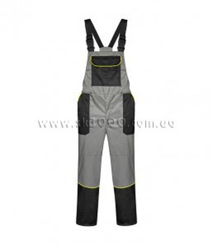 Напівкомбінезон "220в" має нагрудну накладну кишеню з клапаном на липучці та маленькою кишенею у лівому кутку нагрудної кишені. Довжину напівкомбінезона можна регулювати шлейками, при допомозі карабинів та рамок. З боків напівкомбінезон застібається на гудзики. Гульфік на блискавці. Бічні кишені врізні з вхідом на вскіс. Позаду є дві накладні кишені. Наколінники посилені додатковими накладками з тканини. Штанини відрізні нижче колін, а в шов вставлений жовтий кант. Тканина: Грета. Колір: сірий/чорний.