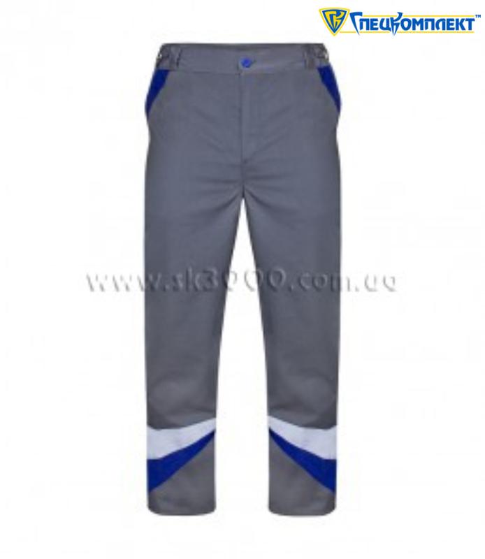 Штани "3D" прямі, з приточним поясом, який застібається на гудзик, зі шльовками під вузький ремінь та гумкою з боків, по поясу. Гульфік на блискавці. Дві бокові кишені з вхідом на вскіс та трикутними вставками волошкового коліру. Дві задніх накладних кишені. Штанини відрізні, нижче коліна, з двома трикутними вставками світловідбивного та волошкового коліру. Тканина: Дефенса. Колір: сірий/волошковий.