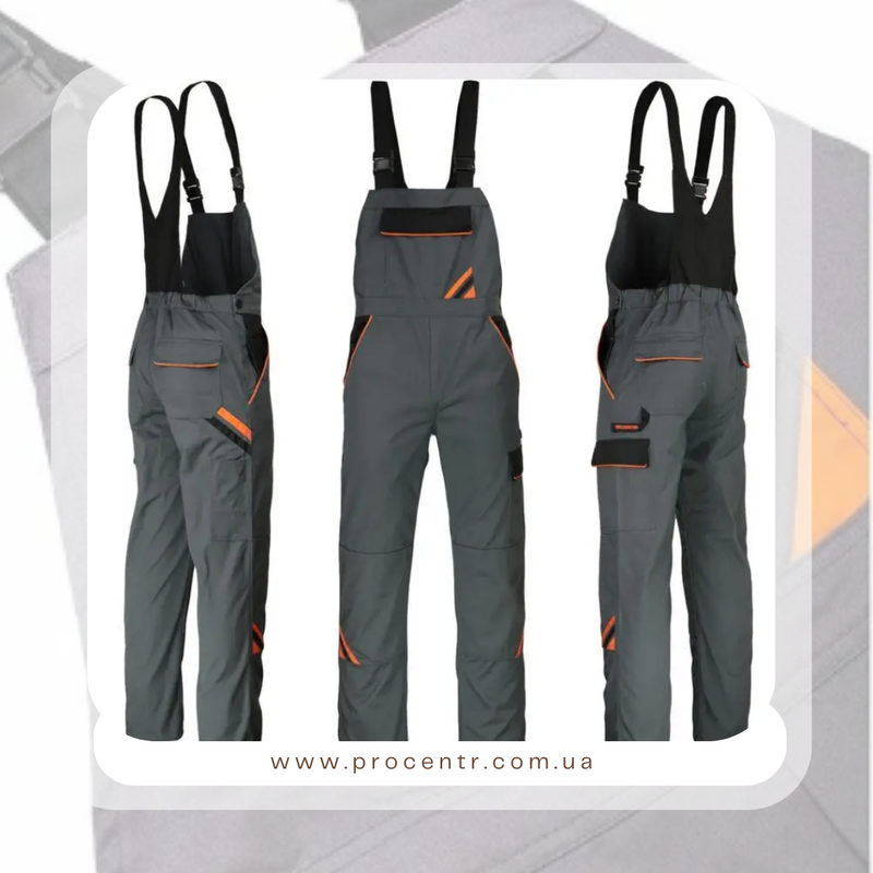 Професійні комбінезони виготовлені з міцної спеціальної тканини 65% поліестеру та 35% бавовни з високою базовою вагою 320 +/- 10 грам / 1 м2 та міцним щільним переплетенням. Характеристики захисного комбінезону: - професійне пошиття та естетика - потрійний та подвійний шов - 6 кишень, додаткова посилена кишеня - посилені задні кишені - 2 накладні кишені на коліна, що допускають використання взаємозамінних наколінників - широкі підтяжки з щільною гумою та міцними пряжками - зручна та практична система регулювання кола талії - низька усадка, навіть після багаторазового прання - стабільність кольору Колір: сталь із вставками оранжевого та чорного кольорів. Art.MaSter ® - торгова марка.