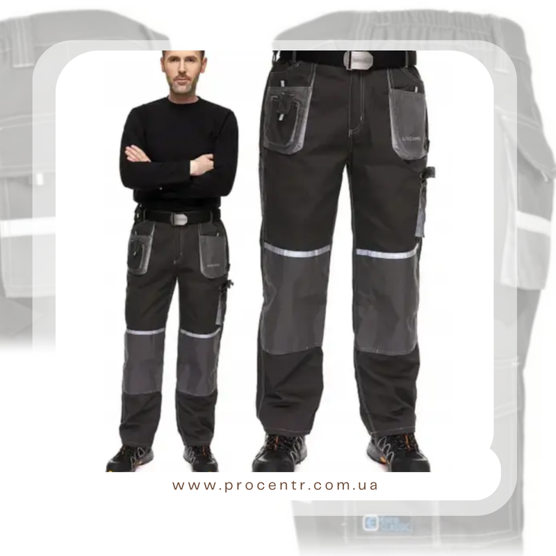 Захисні штани EUROCLASSIC, довжиною до талії, виключно привабливого дизайну та чудової функціональності. Виготовлений з дуже міцної тканини, що складається з 80% поліестеру та 20% бавовни, щільністю 270 +/- 10 г/м2 і міцного щільного плетіння. характеристика: професійне шиття та естетика виконання потрійні шви і численні суцільні закріпки зміцнюють місця, особливо вразливі до розриву світловідбиваючі елементи на задній і передній частині штанин - підвищення безпеки користувача 9 функціональних кишень 2 наколінних кишені, що застібаються на липучку, що дозволяє використовувати змінні наколінники. Кишені посилені поліефірною тканиною 600D Oxford, яка характеризується високою міцністю, стійкістю до стирання та розтягування, а також водонепроникністю. застібається спереду на кнопку та блискавку зручна і практична система регулювання обхвату талії за допомогою бічних гумок дуже низька усадка, навіть після багаторазового прання стійкість кольору Колір: сірий графіт з сірим і світловідбиваючими елементами