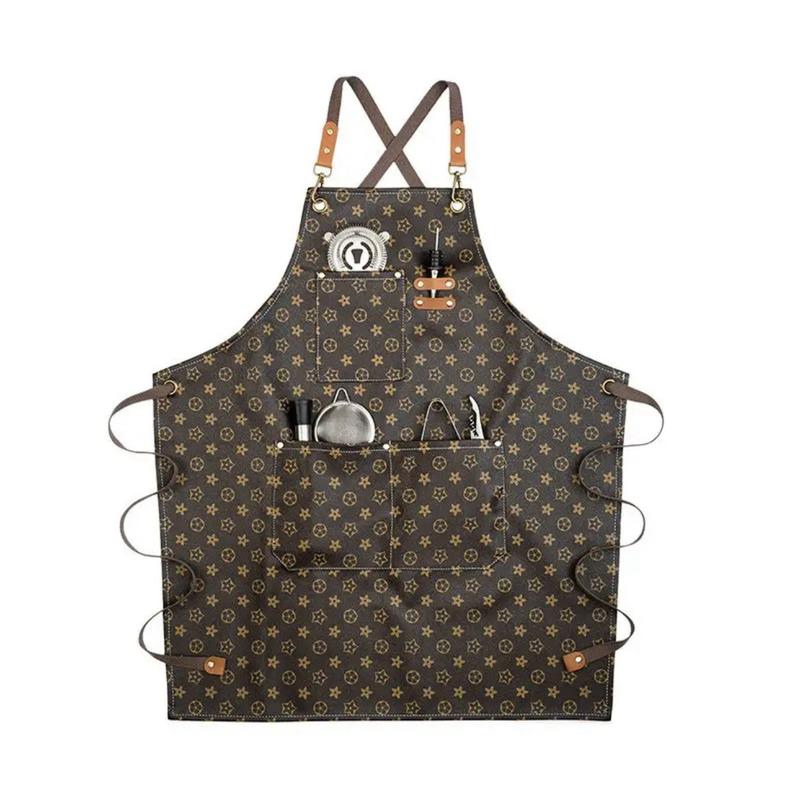 Фартух "Віттон-Квітка" виготовлено зі штучної шкіри яка не промокає та легко витирається від бруду. Модель стандартного фартуха з високим нагрудником, на якому розташована квадратна кишеня на дві шкіряні стрічки для кріплення олівця, та нижньої частини на якій розташовано прямокутну кишеню з двома відділеннями. У верхніх кутах кишень встановлено металеві заклепки. Бретелі виготовлено з тканинної ремінної стрічки яка кріпиться через карабін до верхньої частини нагрудника, через металеві люрекси. Ширина нагрудника: 23 см. Висота фартуха: 73 см. Ширина нижньої частини: 61 см. Матеріал: штучна шкіра. Колір: коричневий.