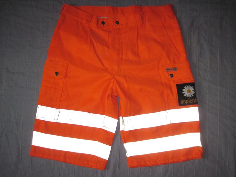 довжина 59 см довжина від паху 30 см напівобхват пояса 45 см (робиться меншим) напівобхват стегон 54 см напівобхват штанки знизу 28 см, Спереду дві прості кишені, на стегнах дві кишені і ззаду одна на кнопках Тканина щільна Колір помаранчевий світловідбивачі стан ідеальний