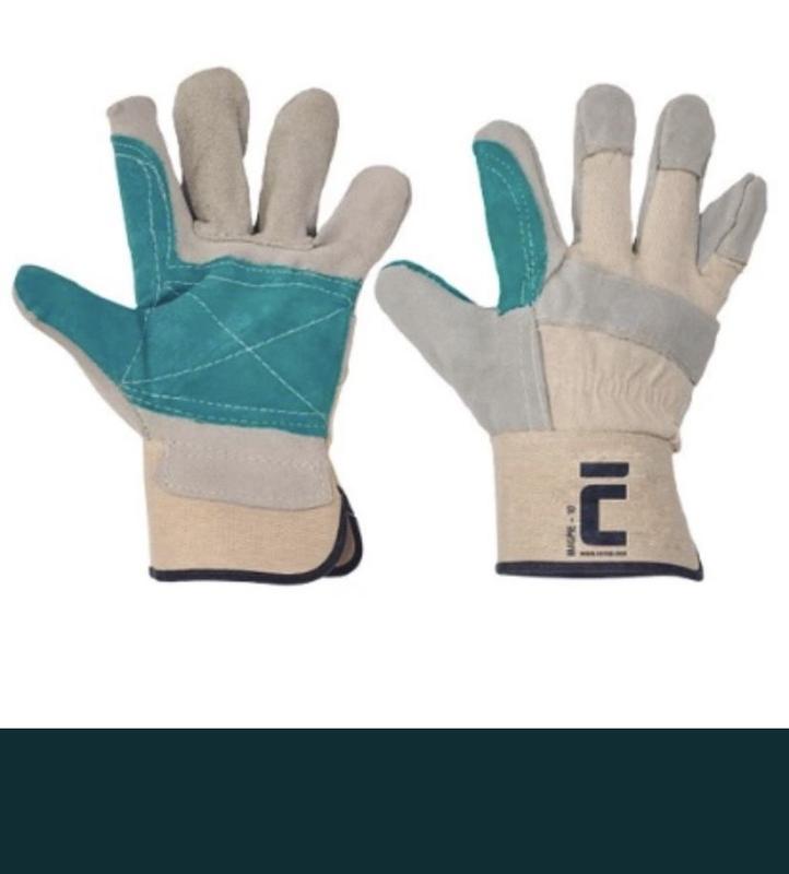 Рукавички з коров'ячої шкіри з підкладкою і армованим шаром в області долоні, з білою бавовняною тканиною на тильній стороні і з жорсткою манжетою. Розмір 10