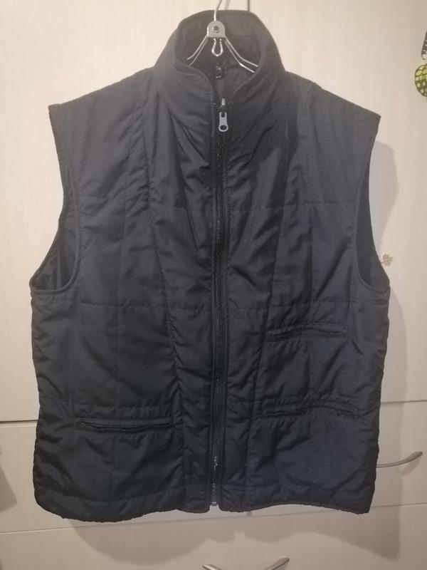 Легкая, слегка утепленная жилетка, спереди три кармана на молнии, в воротнике - капюшон. Застежка - молния.