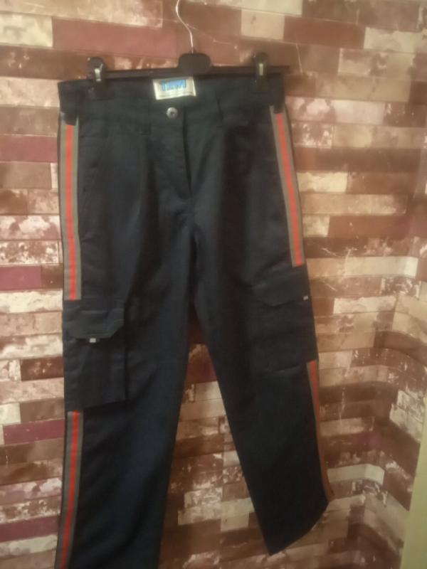 брюки штани мужские рабочие.темно синий кольор з ломпасами по бокам . накладные карманы по бокам.всего карманов 6шт.Замери по талии 40 по бёдрам 53 длина 98 ширина штанини 23по низу. средняя посадка средний шов 26+37
