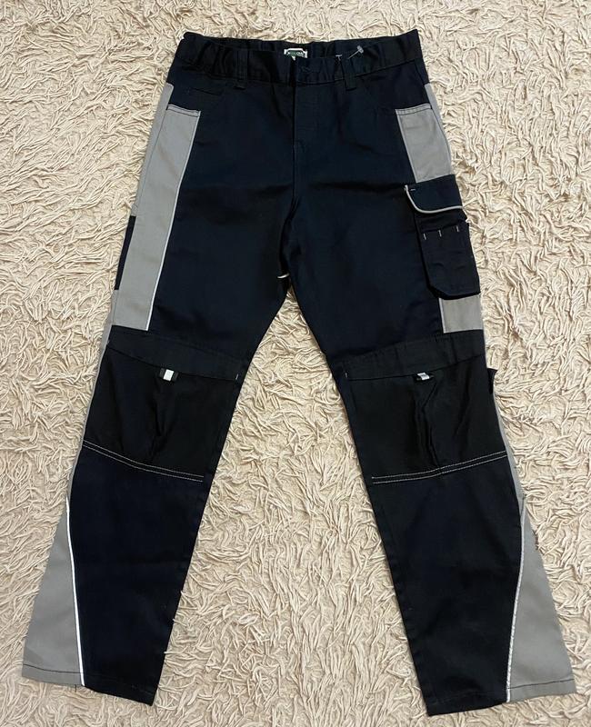 Новые детские (для подростков) рабочие штаны KingCraft Германия 🇩🇪. Размер 146/152. Брюки повышенной прочности для работы и не только. Германия. Оригинал. Наружная ткань: 65% полиэстер, 35% хлопок. Отделка: 100% полиамид. Долговечная ткань - Twillqualität Со многими практическими карманами для инструментов, мобильного и т.д. Имеются светоотражающие элементы В поясе есть утяжка (см. фото). Оптимальная мобильность. Защита колен от арматуры - Einsatzvon Качественная фурнитура YKK. Одежда сертифицирована международной системой тестирования текстильных изделий- Oeko-Tex Standard 100. Замеры: полуобхват в поясе 35-38 см полуобхват в бедрах 45 см длина 93 см