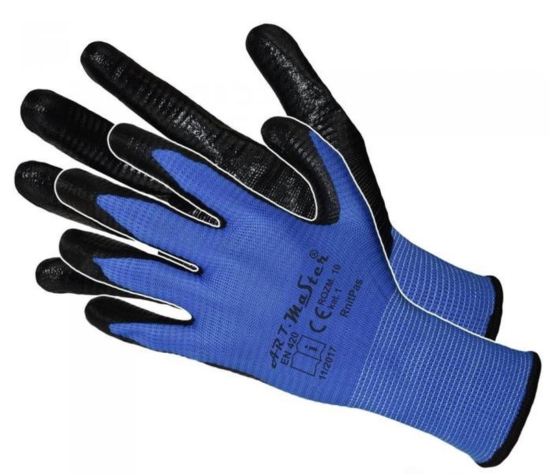 Захисні рукавички Artmas RnitPas Захисні рукавички з трикотажу поліестеру синього кольору, покритого нітрилом чорного кольору. - ребриста структура нітрилового покриття, - оброблений рантом, - безшовні. Розмір: 8, 9, 10, 11 Міцний, гнучкий, стійкий до стирання і розриву. Вони ідеально лягають в руку, забезпечують відмінну маневреність і надійний захват інструментів. Нітрилове покриття підвищує стійкість до жирів і масел та знижує потрапляння бруду. Ребриста структура покриття забезпечує підвищене зчеплення. Art.MaSter ® - торгова марка. CE кат.1 EN 420: 2003 + A1: 2009 колективна упаковка: 240/12 пар