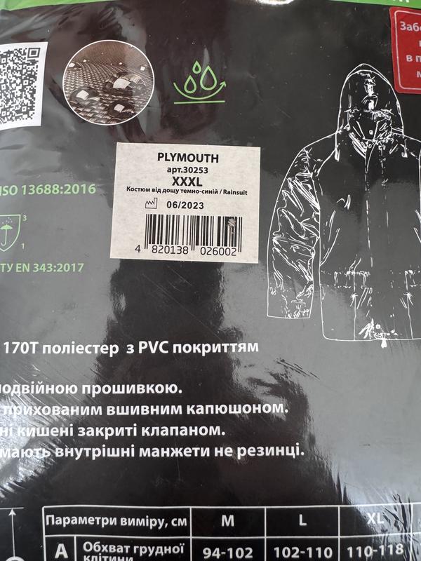 Колір темно синій (додала власні фото щоб чітко було видно колір . На професійних фото —додаткове світло -тому колір значно світліший) КОСТЮМ ВІД ДОЩУ (КУРТКА + БРЮКИ) PLYMOUTH З PVC ПОКРИТТЯМ 3XL Відповідає вимогам ДСТУ EN ISO 13688, ДСТУ EN343 Робочий одяг волого- та вітрозахисний, легкий, компактний, стійкий до зминання Шви костюма з подвійною прошивкою та додатково проклеєні Модель виконана з поліестеру - найкращого матеріалу для виготовлення вологостійких плащів і костюмів. Одяг з поліестру має підвищену міцність, довговічність, стійкість до деформації і ультрафіолету, легко очищуються від бруду. PVC покриття додатково збільшує термін експлуатації виробу та покращує міцністні характеристики, а також волого- та вітрозахисні властивості. Технологія герметизації швів дозволяє забезпечити повну водонепроникність виробу Куртка на блискавці з додатковою захисною планкою на кнопках комір прямий з прихованим у нього вшивним капюшоном щільність прилягання капюшона регулюється за допомогою шнурка 2 внутрішні нижні кишені, додатково закриті клапанами вентиляційні отвори з 2-х боків у проймі та по лінії кокетки на спині рукава мають внутрішні манжети на резинці низ куртки регулюється за допомогою шнурків Брюки на резинці мають вентиляційні наскрізні клапани з 2-х сторін низ фіксується кнопками