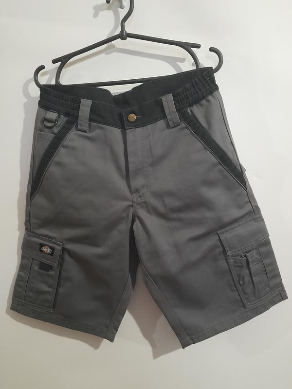 Робочі шорти-карго від відомого бренду Dickies. Двоколірний дизайн - сірий основний з чорними вставками на поясі та кишенях. Шорти-карго/бермуди для роботи. Матеріал: Зносостійка сумішова тканина (поліестер, бавовна), щільністю близько 240-300 г/м2. Безліч кишень, включаючи накладні на стегнах щ логотипом бренду, бічні прорізні кишені та посилені петлі для ременя. Застібка на металевий гудзик та надійна фурнітура YKK. Шорти довговічні та зручні для майстрів та будівельників. Розмір: S/M Виміри: Півобхват поясу: 39-43 см. Посадка спереду: 28 см. Півобхват стегон: 52 см. +- Довжина: 53 см. Ширина штанини на виході: 26 см.