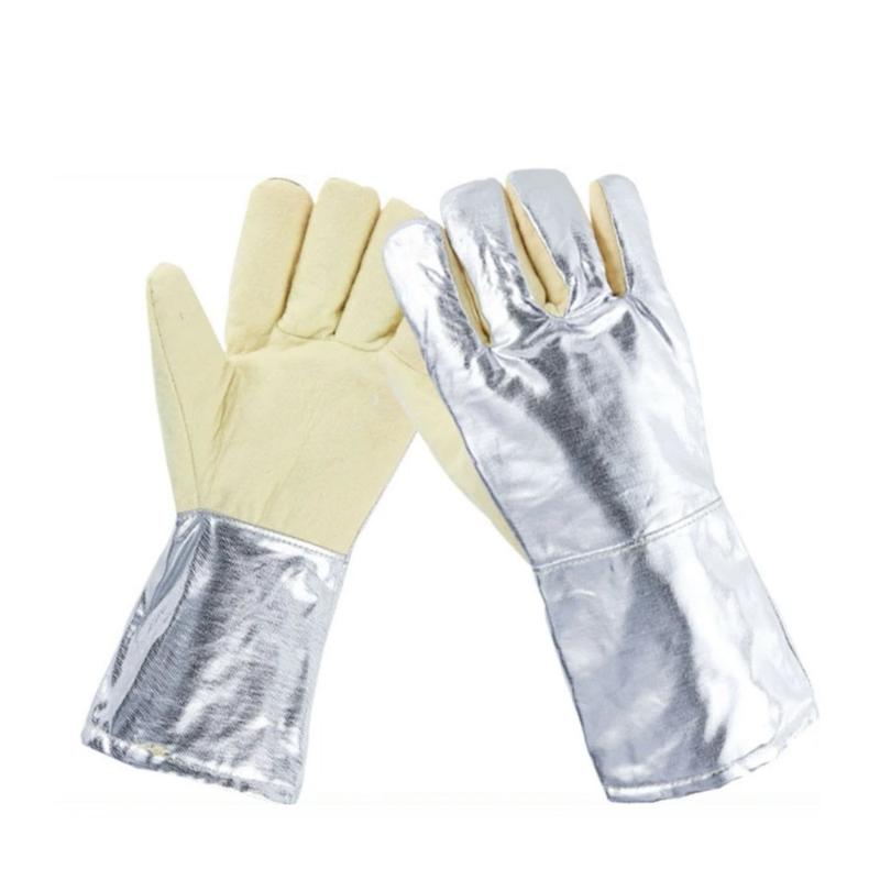 Перчатки термостойкие "Алюмин+Композит" выполнены в комбинации эластичной композитной ткани (долонник и пальцы) с алюминиевой фольгой (тильная сторона ладони и краги). Внутренняя сторона перчатки выполнена из мягкого теплоизоляционного материала. Прошитые кевларовой нитью. Предназначены для работы возле печей (ливарное производство и производства стекла). Тепловое излучение: до +500 С. Температура контакта: +300 С. Длина: 36 см. Вага: 260 г. Страна производитель: Китай.