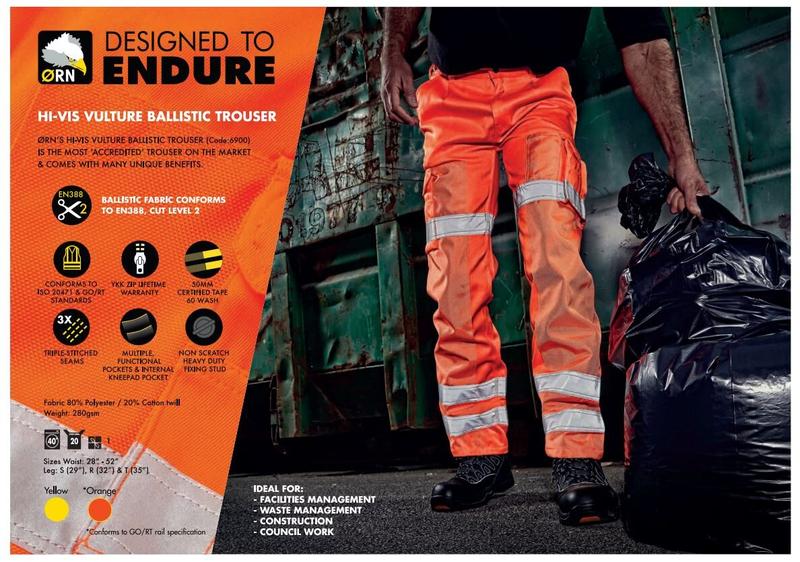 Orn HI-VIS VULTURE BALLISTIC (6900) Штани протестовані на оригінальний крій,багатофункціональні, зносостійкі штани. Відповідає EN ISO 20471 - клас 1 і RIS-3279-TOM (стандарти для оранжевого кольору) Стійкість до проколів Рівень 4 (EN 388: 2016) Рівень відсічення B (EN 388: 2016) Кишені на ногах у бойовому стилі, кишеню для мобільного телефону на стегні Потрійна прострочка на основних швах для максимальної міцності Балістична тканина відповідає стандарту EN388, рівень розрізу 2, забезпечуючи велику захист для користувача. Эластичный пояс по бокам для гибкости и комфорта Два передних кармана Два задних кармана Два боевых кармана Сверхпрочная подкладка карманов Сверхпрочная фиксирующая шпилька на поясе, предотвращающая появление царапин Высококачественная латунная молния YKK Шлевки 3 длины штанины 80% полиэстер 20% хлопок Вес ткани 280 г GO / RT 3279 EN471 КЛАСС 1: 2 Ширина в поясе 52-55 см , полу ОБ 68 см , длина по внешнему шву 102 см , по внутреннему шву длина 70 см , глубина 32,5/44 см , ширина штанины низ 24 см !