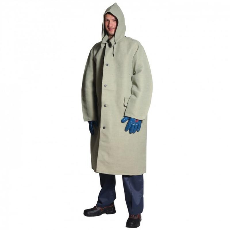Плащ прямого силуету з центральною застібкою на гудзиках, з відкладним коміром і пристегивающимся капюшоном. На поличках бічні накладні кишені з клапанами, що застібаються на ґудзики. Спинка з середнім швом і шліцом. Капюшон по особовому вирізу стягується шнуром і пристібається до горловини на гудзики. Рукава втачного, двошовні. Під проймою - вентиляційні отвори для повітрообміну. Чоловічий захисний плащ виготовлений з міцного матеріалу (брезенту). Надійно захищає від проникнення води і вологи, а також не дозволяє іскрам і окалинам травмувати працівника металургійного комбінату, дорожника і представників низки інших професій. 150 грн ПЛАЩ з написом 200 грн - без напису 250 грн цупкий брезент