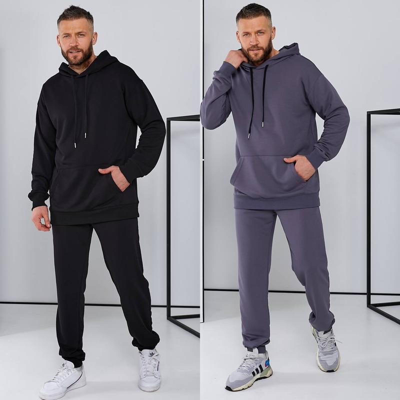Костюм чоловічий Мод.0381 Тканина: тринитка петля, Туреччина (95% бавовна, 5% еластан) Тканина не кашлатиться та не линяє Розмір: S, M, L, XL, 2XL, 3XL Колір: графіт, чорний Ціна: 1350 грн Костюм спортивний: кофта вільного крою, плечовий шов приспущений, з кишенею кенгуру, подвійний капюшон, рукава на манжетах з рібани. Штани на резинці, середня посадка, з кишенями, внизу манжет з рібани