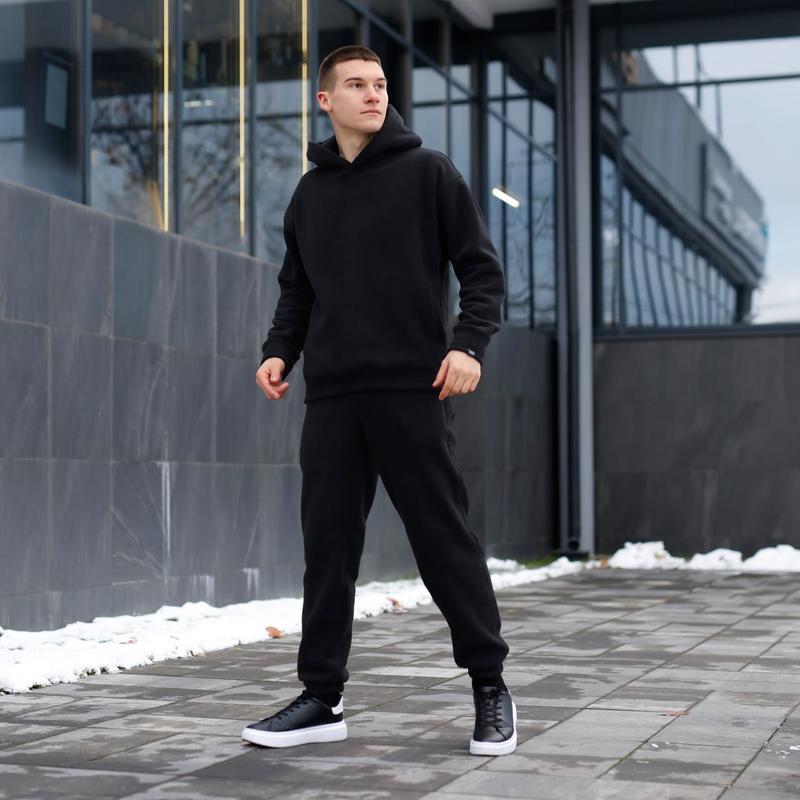 ▪️Костюм Pobedov Mariot Колір: темно-сірий, чорний. Розміри: S M L XL XXL ▫️Матеріал: фліс (100% polyester) ▫️Стильний костюм вільного крою. ▫️Кофта з двома кишенями та спущеним рукавом. ▫️Низ і манжети з основної тканини. ▫️Наявний капюшон. ▫️Пояс штанів фіксується на резинці та додатково стягується шнурком. ▫️У штанах 2 бокові кишені для рук і 2 накладні кишені вище коліна. ▫️Низ виробу - манжет з основної тканини з резинкою. ▫️Сезон: осінь/зима