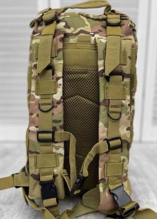 Тактический рюкзак 38 л multicam Рюкзак состоит из 5 отделений. Основное отделение имеет расширенную до самого низа молнию, что значительно облегчает как упаковку, так и извлечение вещей. Внутри него - меньший карман на молнии и сетчатая перегородка. Второе большое отделение внутри имеет двойной маленький карман с вшитой сеткой с 2 отделениями. Внешний верх, маленький карман. Внешнее дно, карман большего размера - внутри имеет двойной маленький карман с сеткой, сшитой с 5 отделениями. На внешней стороне рюкзака есть перегородка, запирающаяся на липучке. * Backpack Quick Release System - рюкзак имеет несущую систему, которая состоит из профилированных подтяжок с быстросъемными пряжками, это практичное решение и используется для мгновенного сброса рюкзака. За стабильную толерантность отвечают плавная регулировка профилированных подтяжк, нагрудный ремень и поясной ремень, который можно отсоединять - ремень позволяет снять нагрузку с позвоночника и плеч при носке рюкзака - весь вес сосредоточен на бедрах. На передней части рюкзака и на нагруднике используются лямки PALS, которые позволяют фиксировать опору в системе MOLLE – это позволяет установить дополнительные карманы. * Полная регулировка - боковые стенки, дно рюкзака и его верхняя часть имеют регулируемый лямку, который застегивается на пряжку - это используется для сжатия рюкзака. Укорачивание лямок рюкзака позволяет открыть его, например, когда основное отделение практически пусто, а карманы только меньшего размера. Регулируемые ремни также могут пригодиться при креплении портативного оборудования, такого как спальное место, палатка и т.д. * Жесткость - спина и раскосы были укреплены, покрыты пропускает воздух сеткой, в значительной степени она также подавляет вибрации - это особенно важно во время длительных поездок. Рюкзак изготовлен из прочного, водонепроницаемого материала, устойчивого к разрывам и истиранию. Изнутри он покрыт резиной, которая защищает его от попадания воды. * Материал: нейлон/полиэстер 600D * Емкость: 38л * Размеры (Д/Ш/В): 29/37/50см * Вес набора: 1кг art13173