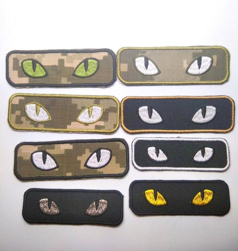 Щеврон очі котячі, що світяться в темряві на липучці. Очі вишиті світлонакопичувальні нитки. Накопичують сонячну енергію днем, або від лампи. 8.5 на 3 см - це стандартний розмір. Підходить на кепку, на рюкзак то що. Можна зробити шеврон по вашим розмірам. Виготовлення будь яких шевронів під замовлення. Власне виробництво.
