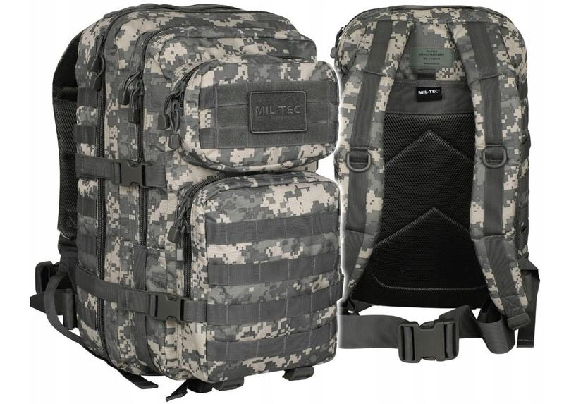 Рюкзак 36 літрів Assault AT-Digital Mil-tec 14002270. Розмір: 51*29см*28 см Вага: 1600 г. Рюкзак MIL-TEC Assault AT-Digital є чудовим, містким міським рюкзаком. Короткий опис рюкзака MIL-TEC AT-Digital: Сам рюкзак вийшов містким, комфортабельним та універсальним. Місткість аж 36 літрів робить його ідеальним пристосуванням для всіх випадків життя. Безліч внутрішніх маленьких кишень для жодної дрібниц. Всі ці речі, безсумнівно, знадобляться в будь-якому поході. Рюкзак має зручні та міцні бічні фіксатори, які дуже корисні для того, щоб рюкзак зберіг необхідну форму й об'єм. Товар зроблений зі 100% поліестеру з полівінілхлоридним покриттям, це означає, що він не промокатиме, і слугуватиме довго. 2. Особливості рюкзака MIL-TEC Assault AT-Digital Рюкзак дає змогу переносити чимало речей, попри середні габарити. Внизу є ремені, на яких можна закріпити спальний мішок або каремат. По всій поверхні є стропи Моллі для навісного спорядження. Також є кілька зручних і функціональних відділень із фірмовою застібкою-блискавкою і з різними сітчастими кишенями всередині, є вбудована кишеня на липучці для гідросистеми. Крім того, рюкзак Міл-тек обладнаний щільною спинкою з демпфером і вентиляційною системою. Ергономічні плечові лямки завширшки приблизно 5 сантиметрів можна швидко приборкати або подовжити. Для зручнішого носіння є пояс із застібкою Fastex, який також легко налаштовується під параметри носія. За потреби його можна розстебнути двома пальцями. Виробник: MIL-TEC