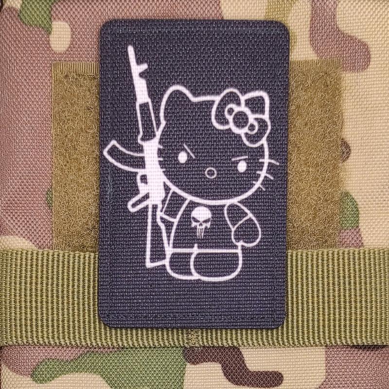 Китти с автоматом, патч печатный Размер - 8х5 см. Способ крепления - липучка (велкро). Основа - ткань Оксфорд. Способ изготовления - сублимационная (водостойкая) печать. Прошит по контуру. Использованы водо и износостойкие материалы. Лазерная обработка края.