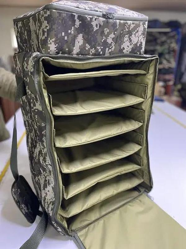 Тканина Cordura .В середину всіх частин сумки вшитий тонкий полікарарбонат який запобігає механічному пошкодженню вантажу.Основне відділення відкривається за принципом валізи та поділене на окремі секції для зручного розміщення семи дронів. Якщо зняти внутрішні відсіки, то сумка-рюкзак дозволяє вмістити 12 дронів без батарей. Зверху рюкзака передбачили спеціальнe відділення для додаткових пристроїв: пульта керування, акумуляторів, окулярів, кабелів тощо.З боку є кишеня з водонепроникною блискавкою яка зберігає речі від вологи. На фронтальній частині рюкзака є шнурівка з еластичної резинки з фіксатором, яка дає можливість переносити куртку, маскувальну сітку або інші подібні речі. Плечові лямки оснащені системою швидкого скидання. Додаткові ручки з обох боків дозволяють нести рюкзак як у горизонтальному, так і вертикальному положенні. Розміри: основний відділ – 68 х 38 х 38 см верхня кишеня – 33 х 37 х 10см.