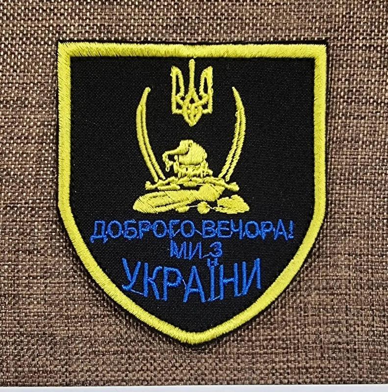 Ціна вказана за 1 шт Шеврон "Добрий вечір, ми з України" Розмір: 85х95мм Колір основи: Чорний Кріплення: липучка, жорстка частина